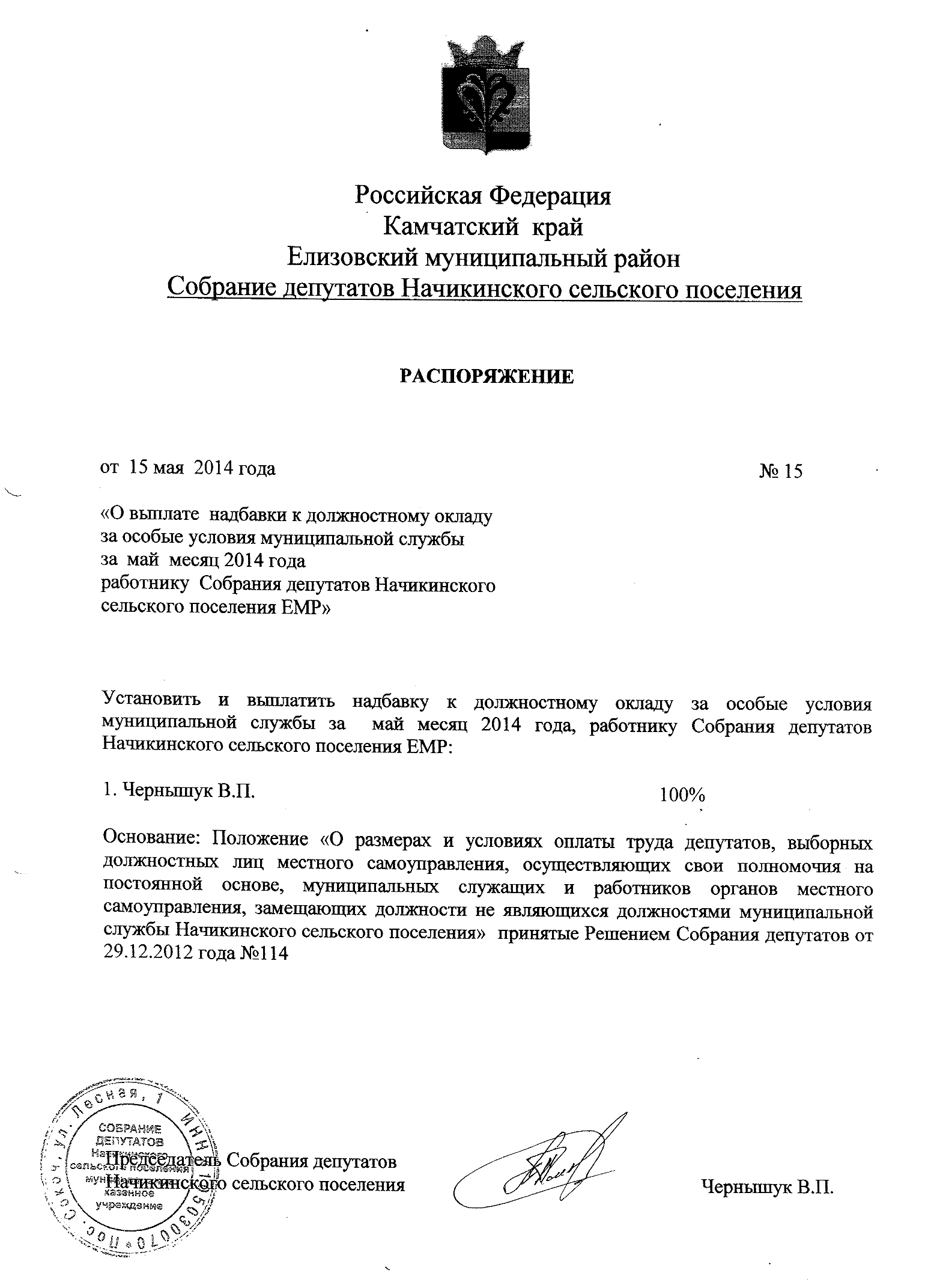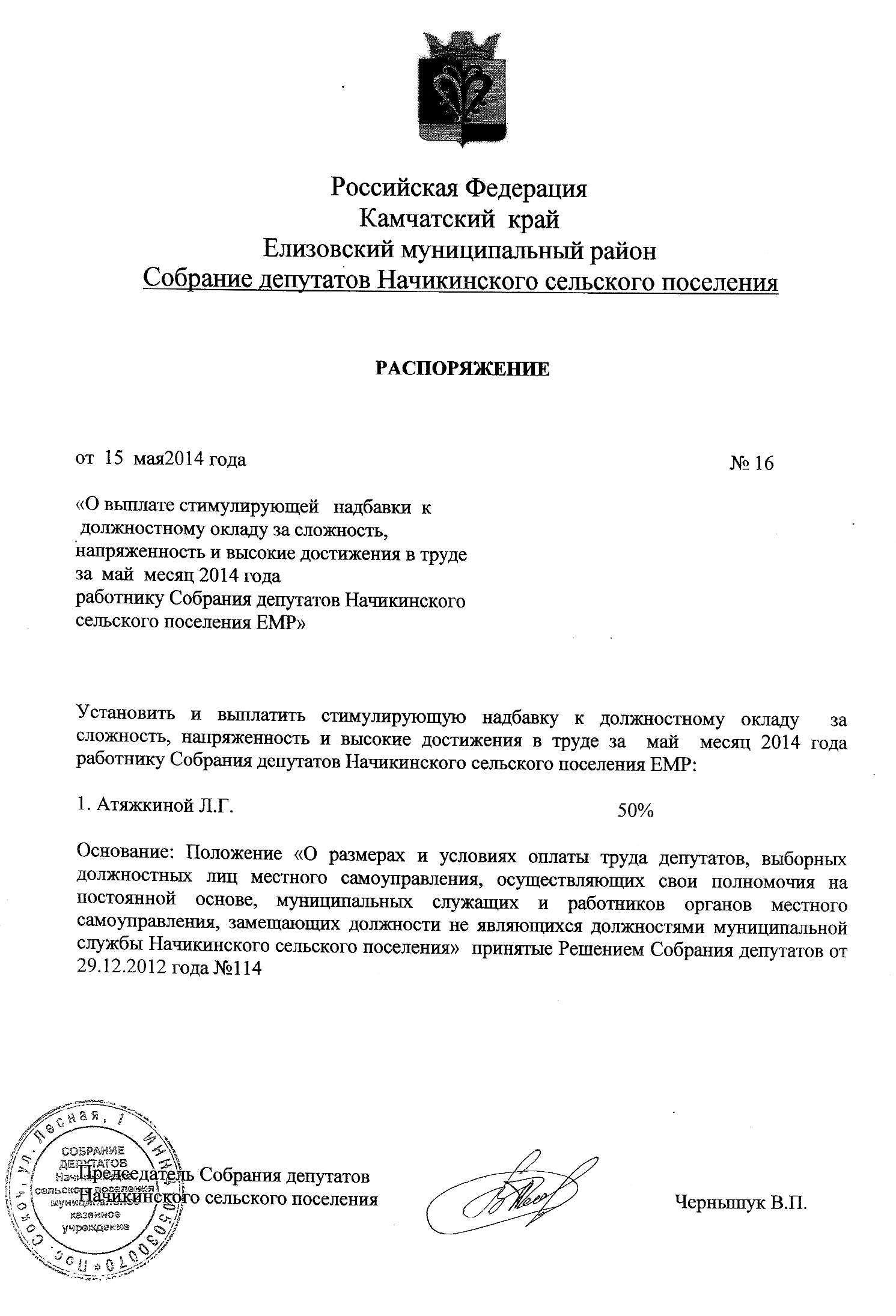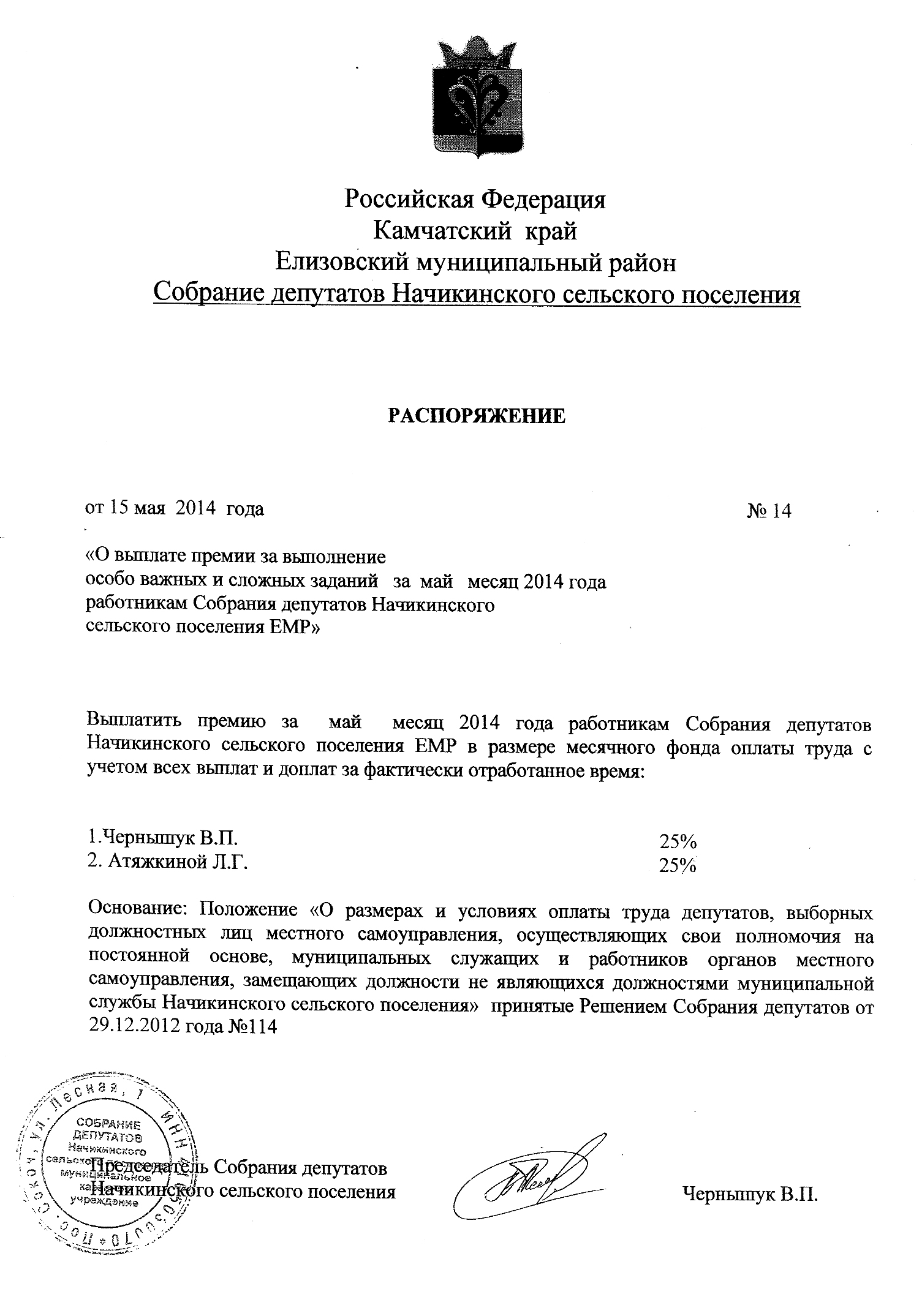 После выхода публикации о том, что бывший председатель Собрания депутатов Начикинского сельского поселения Владимир Чернышук с конца декабря 2013 года по июнь 2014-го, не исполняя своих обязанностей, не проведя ни одной сессии, тем не менее, не постеснялся регулярно начислять себе заработную плату. Только в мае этого года за его подписью вышли три распоряжения № 14, 15 и 16 со следующими формулировками: «О выплате прем за выполнение особо важных и сложных заданий за май месяц 2014 года работникамСобрания депутатов Начикинского сельского поселения ЕМР […] Чернышук В.П. – 25 %, Атяжкиной Л.Г. – 25%»;