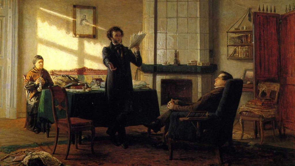 На полотне Александр Пушкин читал другу вслух комедию Александра Грибоедова «Горе от ума», привезенную Пущиным с собой. Пьеса привела поэта восторг, поэтому он декламировал её стоя. На заднем плане изображена няня Арина Родионовна, которая оторвалась от вязания, чтобы послушать любимого и талантливого воспитанника.